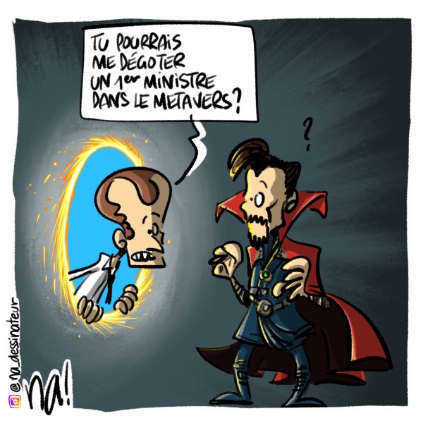 NActualités communication, crise, dessin de presse, dessin humour, dessinateur, dessinateur de presse, docteur strange, emmanuel macron, gouvernement, l'oeil de na!, loeildena!, manuel valls, metavers, na!, na! dessinateur, politique, premier ministre, remaniement, super héros